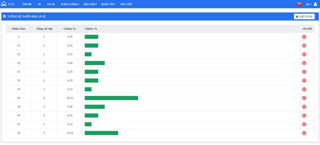 Bước 2 : với mỗi lái xe, bạn có thể xem chi tiết cụ thể của từng lái xe đó, bằng cách kích vào chỗ chi tiết của lái xe tương ứng. Bảng chi tiết cuốc khách của lái xe như sau: